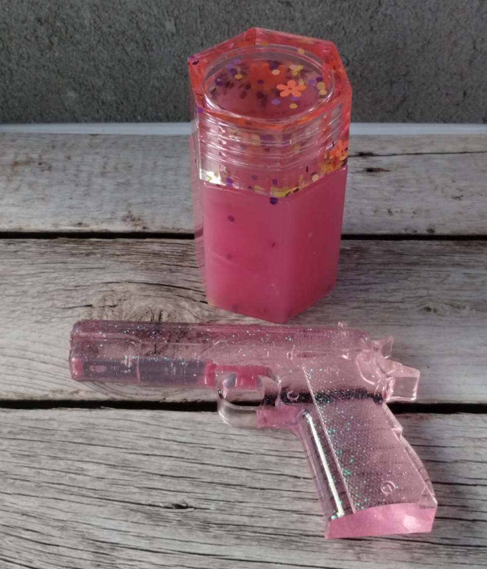 Our handgun replicas are epoxy or Crete resin. You choose. They are available in two (2) models. Both models come with two (2) bullets. Available in a variety of colors (translucent & opaque resin, or hand-painted Crete resin).